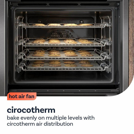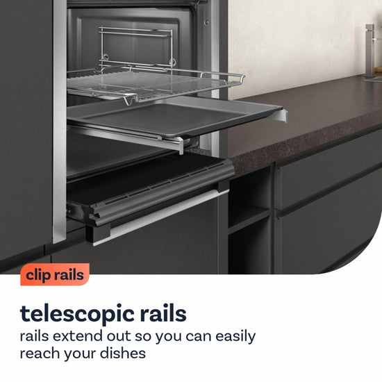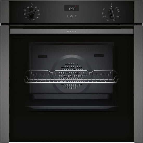 The Neff N50 B3ACE4HG0B graphite grey Slide & Hide single oven has 7 cooking functions including fan, conventional baking, and grill functions. The oven has a steam cleaning function and a catalytic-coated back panel to make cleaning the oven even easier.