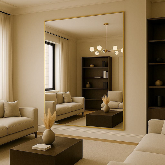 Unlike traditional full-length mirrors, this model offers both width and height, making it ideal for oversized furniture pairings or standalone display. The mirror glass is 4mm thick and safety-backed, ensuring both clarity and durability in high-traffic spaces.